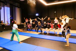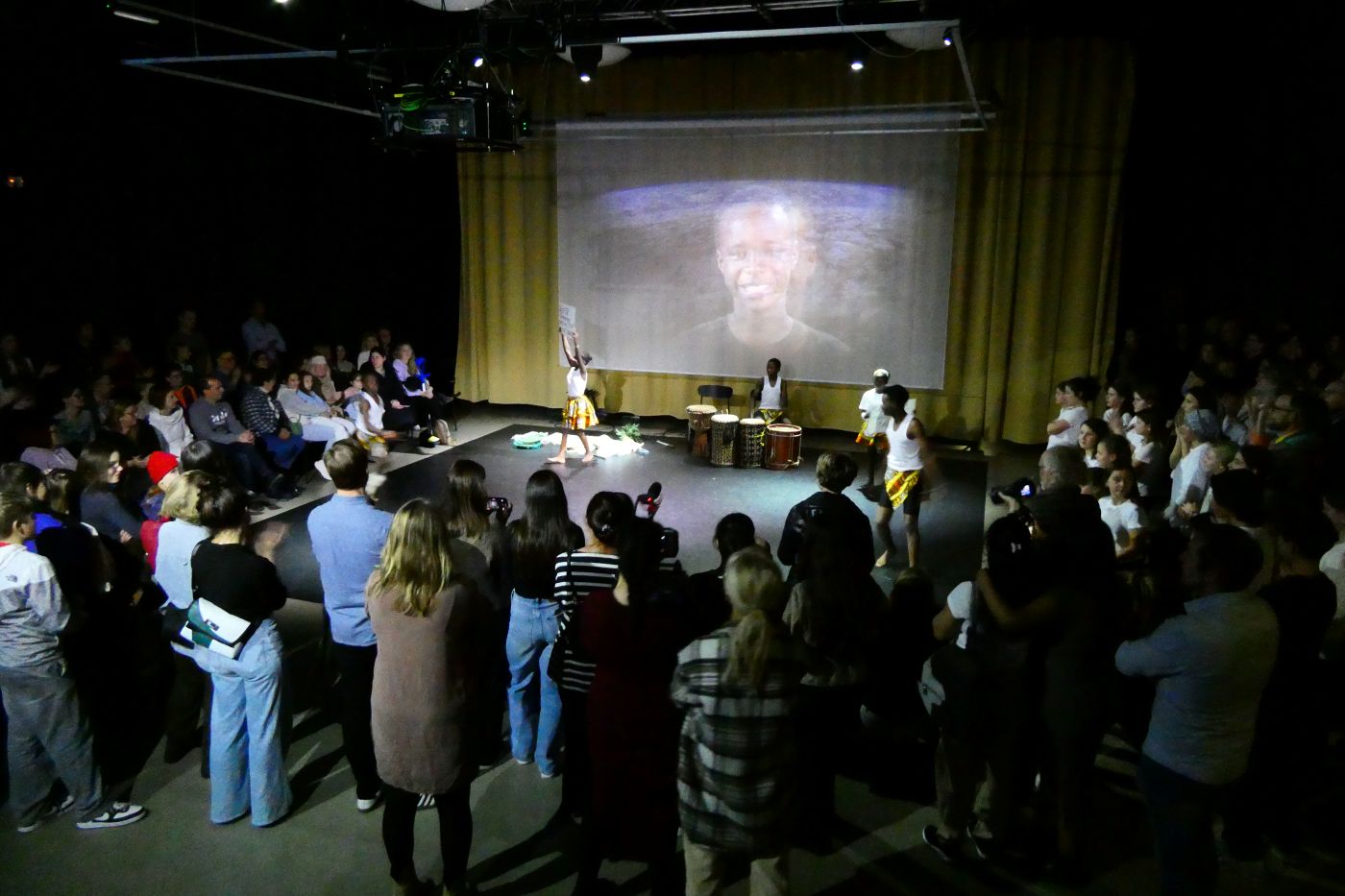 Der Auftritt von NAFSI und den Brühler Kindern und Jugendlichen wurde zusätzlich durch Videoproduktionen bereichert, die auf zwei großen Leinwänden projiziert wurden. Diese Filme hatten Schülerinnen der Gesamtschule Brühl in den Workshops selbst erstellt – ein eindrucksvolles Zusammenspiel von Tanz, Akrobatik und kreativer Medienarbeit.