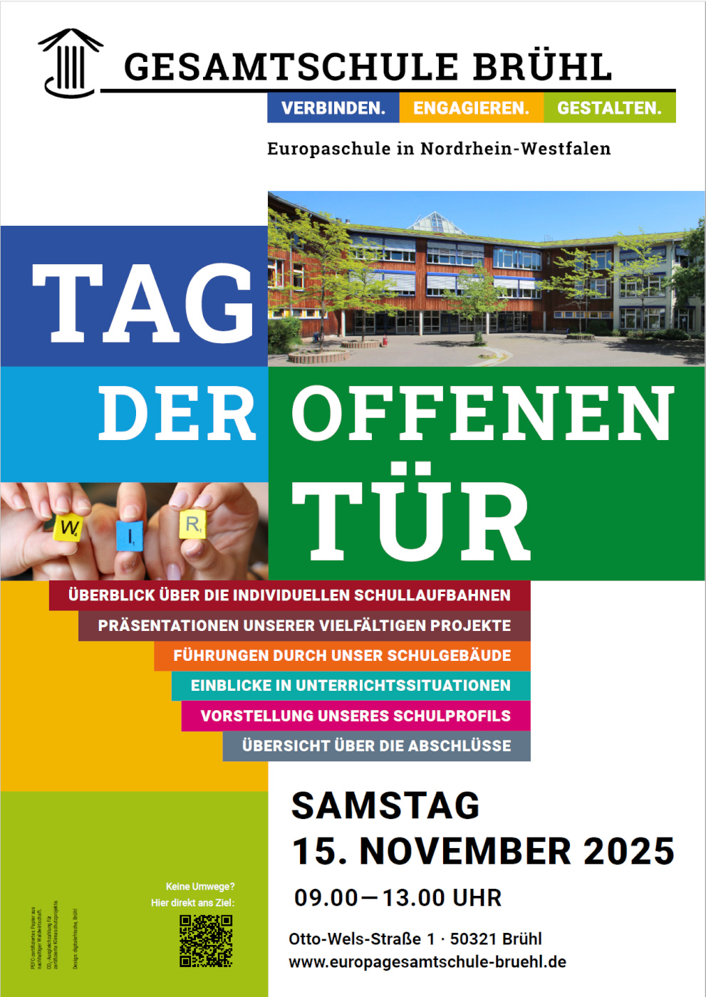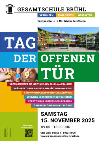 am Samstag, dem 15.11.2025 heißen wir Sie und euch von 9-13 Uhr herzlich willkommen in unserer Europagesamtschule! Es wird zahlreiche Stände, Aufführungen und Mitmachangebote geben. Natürlich steht der Unterricht unserer Kinder und Jugendlichen im Mittelpunkt. Die 5. und 6. Klassen sind geteilt, so dass Sie und ihr ausreichend Platz zum Hospitieren habt. (9.30-11.50 Uhr). Eine 6. Klasse zeigt unser neues, innovatives Projekt 6 und die 7. Klassen zeigen das umfangreiche "Wahlpflichtangebot" (-> 4. "Hauptfach" bei uns). Die Oberstufe hält den Leistungskursunterricht (9.10-12:50 Uhr) mit offener Tür ab, so dass man hier und da reinschnuppern kann. Neben den normalen Schulführungen haben wir für dieses Jahr auch wieder "Kinderführungen ohne Eltern" ausgebaut... denn Selbstständigkeit und Selbstverantwortung sind die Grundlagen unserer Arbeit und werden bei uns „groß“ geschrieben.