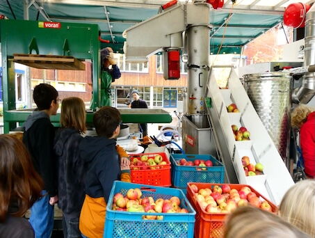 Die Klassen 5c und 5d der Gesamtschule Brühl durften im Herbst einen besonderen Schultag erleben. Während die Klasse 5c gemeinsam mit Jakob vom Kollektiv „Most & Trester“ eine Streuobstwiese in Walberberg besuchte und von ihm viel über das dortige Ökosystem lernte und mit bei der Obsternte anpackte, ernten die Schülerinnen und Schüler der Klasse 5d auf der schuleigenen Streuobstwiese, Birnen und Quitten.