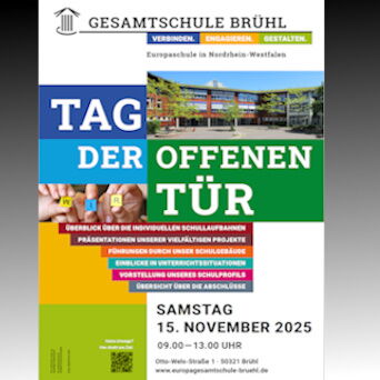 Liebe Eltern, liebe Schüler*innen des vierten Schuljahres und liebe Zehntklässler*innen, am 15.11.2025 heißen wir Sie und euch von 9-13 Uhr herzlich willkommen in unserer Europagesamtschule! Es wird zahlreiche Stände, Aufführungen und Mitmachangebote sowie leckeres Essen geben. Natürlich steht der Unterricht unserer Kinder und Jugendlichen im Mittelpunkt.