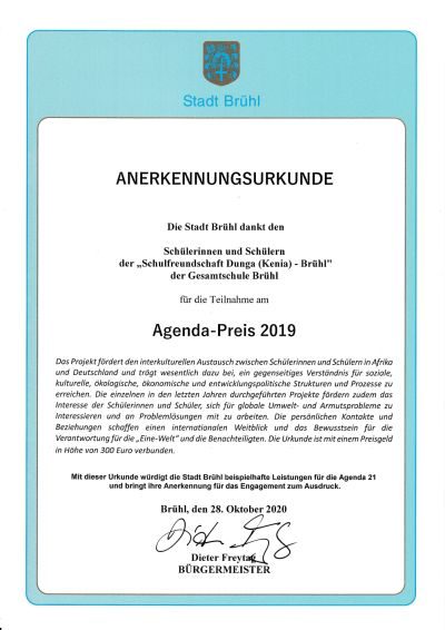 Dunga-Brühl-Schulfreundschaftsprojekt freut sich über Anerkennungsurkunde des Agenda-Preises