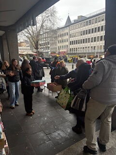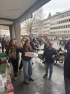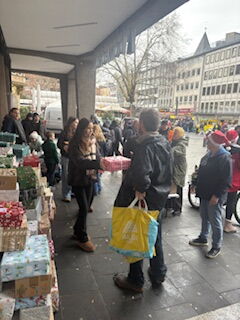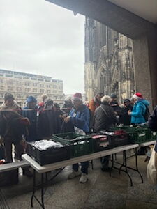 Kurz vor Weihnachten war es dann so weit: Die Gruppe reiste nach Köln, um ihre Geschenke persönlich zu übergeben. Dort trafen sie auf das Team von Juttas Suppenküche, einer Initiative, die sich seit Jahren für Obdachlose einsetzt. Gemeinsam mit Jutta und ihren Helfern verteilten die Schülerinnen nicht nur ihre eigenen Pakete, sondern unterstützten die große Weihnachtsaktion tatkräftig bei der Ausgabe von insgesamt rund 150 weiteren Präsenten.