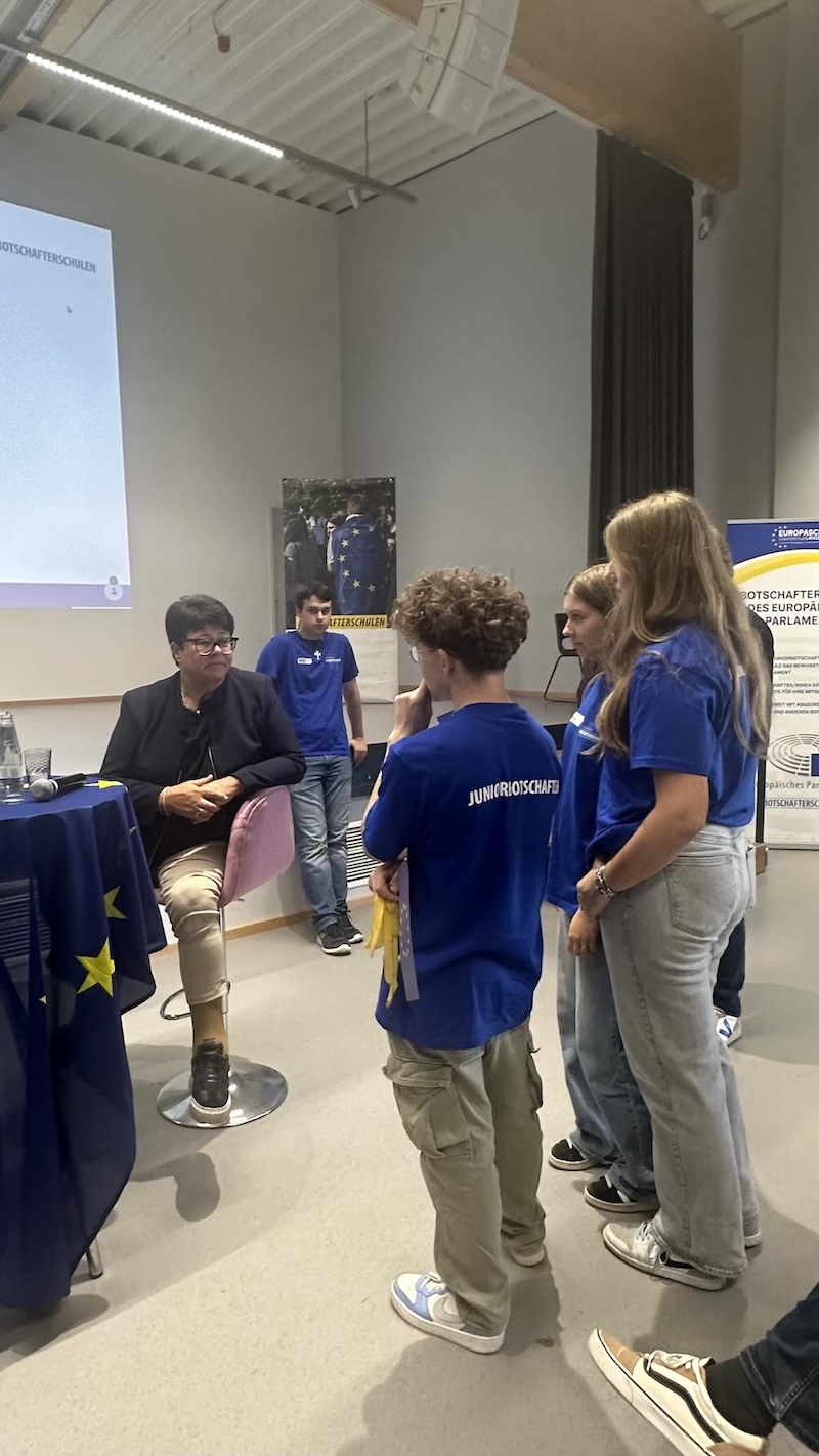 Im Mittelpunkt der Veranstaltung stand der Austausch mit anderen engagierten Schüler*innen von Botschafterschulen aus der Region. Die Teilnehmenden diskutierten aktuelle europäische Themen, präsentierten eigene Projekte und entwickelten neue Ideen, wie sich europäische Werte im Schulalltag lebendig gestalten lassen. Ein besonderer Höhepunkt war die Begegnung mit Sabine Verheyen, Vizepräsidentin des Europäischen Parlaments, die sich Zeit nahm, um mit den Jugendlichen über ihre Anliegen und Fragen ins Gespräch zu kommen.