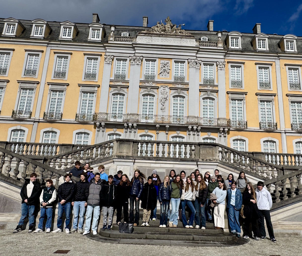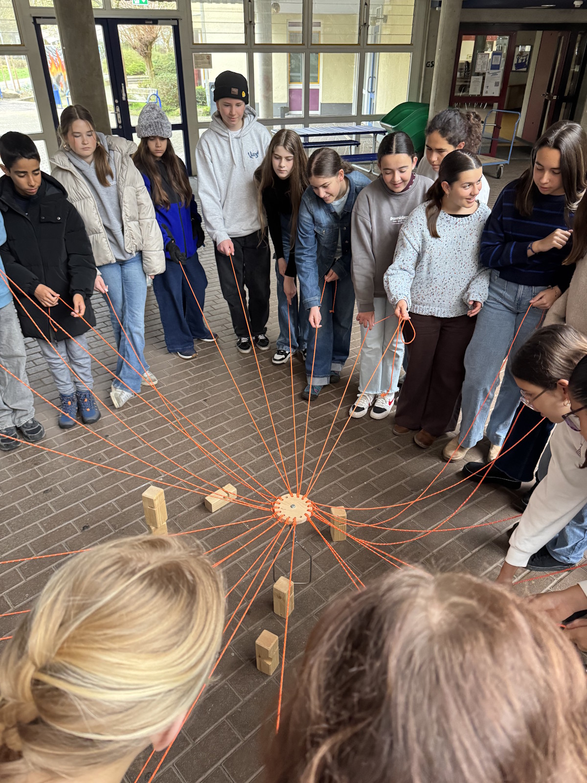 In der Woche vom 16. bis zum 21. März 2026 durften wir bereits zum zweiten Mal Schüler*innen und Lehrkräfte des Colegio Salesiano aus Las Palmas de Gran Canaria im Rahmen unseres Erasmus+-Programms an der Europagesamtschule Brühl begrüßen. Nachdem die deutsche Gruppe bereits im Februar nach Gran Canaria gereist war und sich dort intensiv mit den Themen "ökologische Nachhaltigkeit" und "europäische Werte" auseinandergesetzt hatte, wurde die gemeinsame Projektarbeit nun in Brühl fortgeführt. Um sich als Gruppe auf die gemeinsame Arbeit einzustellen, fanden täglich verschiedene Teamspiele statt – so z.B. auch der "Tower of Power", bei dem die Teilnehmenden gemeinsam einen Turm aus Holzklötzen bauen mussten.