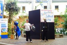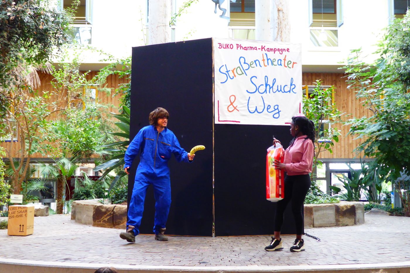 Humorvoll, spritzig, ideenreich, kurios und schräg und doch mit einer klaren Botschaft – so traten die drei jungen Laien-Schauspieler*innen des Straßentheaters „Schluck & Weg“ der BUKO Pharma-Kampagne am 16. September 2022 an der Gesamtschule Brühl auf.