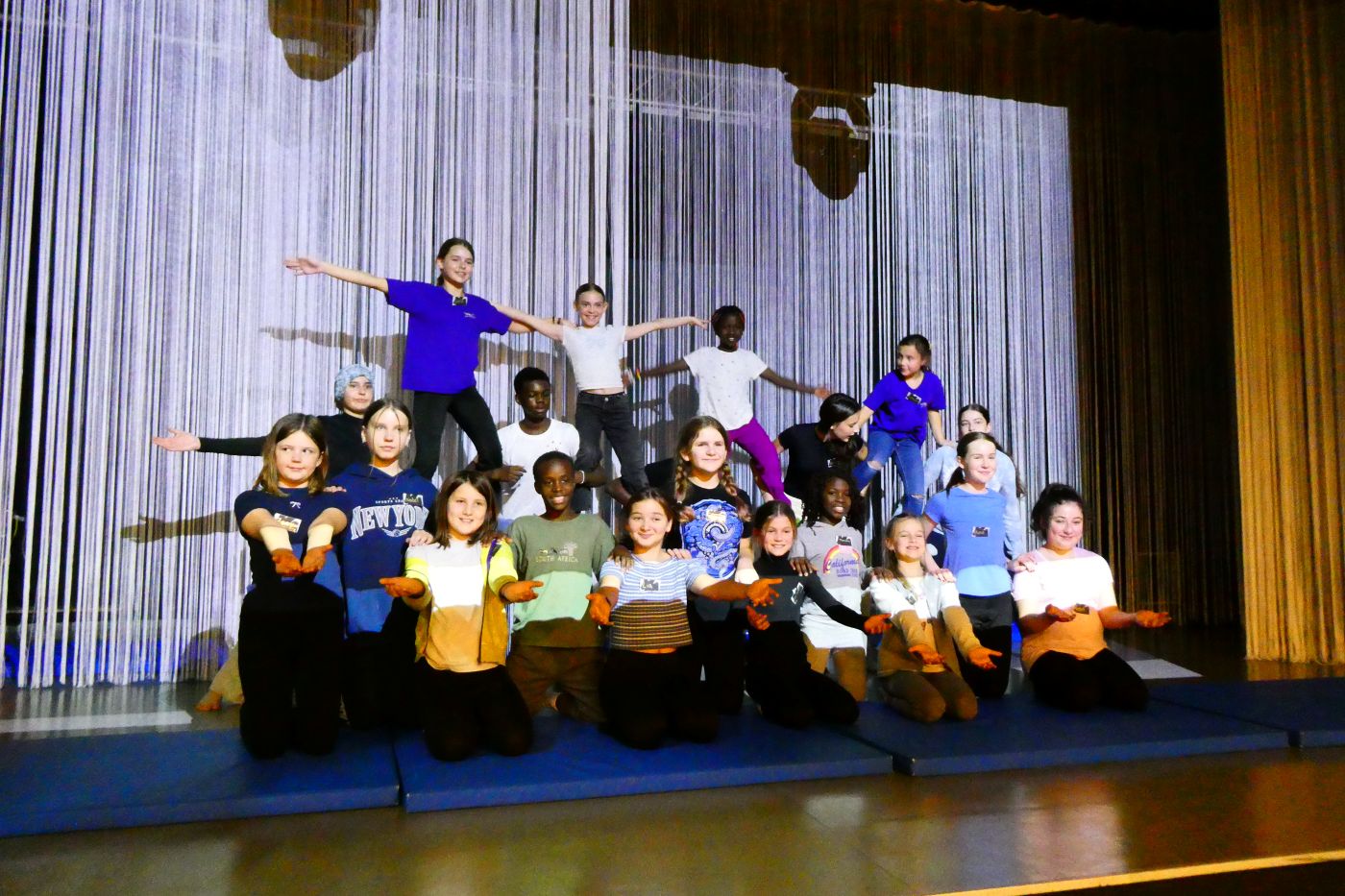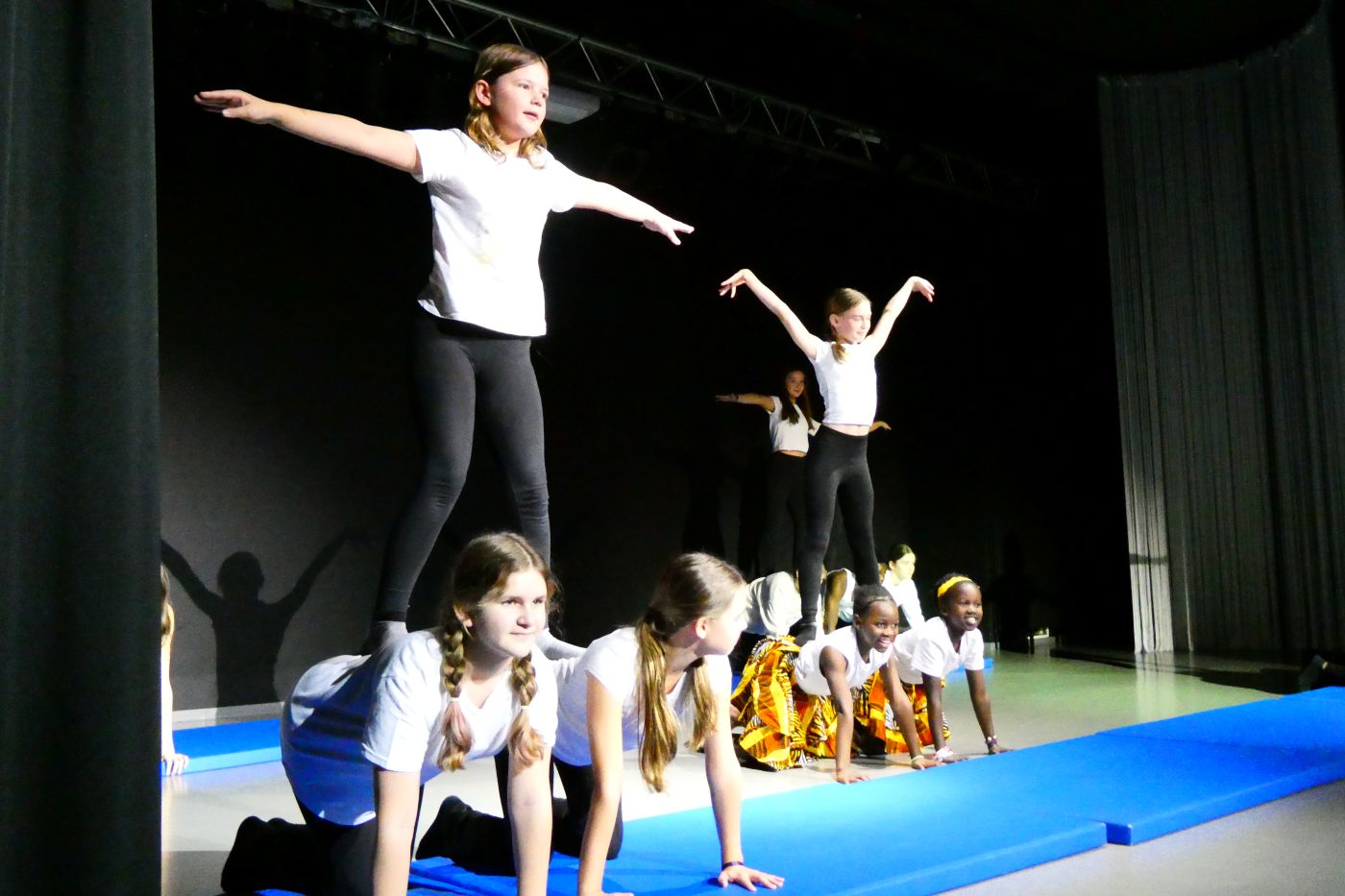 Der Auftritt von NAFSI und den Brühler Kindern und Jugendlichen wurde zusätzlich durch Videoproduktionen bereichert, die auf zwei großen Leinwänden projiziert wurden. Diese Filme hatten Schülerinnen der Gesamtschule Brühl in den Workshops selbst erstellt – ein eindrucksvolles Zusammenspiel von Tanz, Akrobatik und kreativer Medienarbeit.