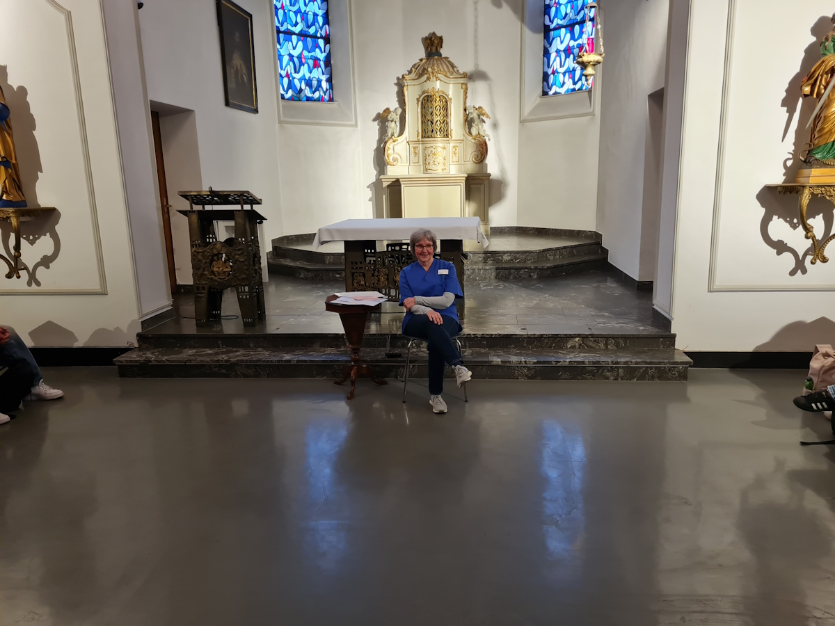 Vor Ort wurden die Schülerinnen und Schüler herzlich von Frau Weinz, der Krankenhausseelsorgerin des Marienhospitals, empfangen. In einem sehr persönlichen und offenen Gespräch erzählte sie von ihrem Alltag, den Herausforderungen ihres Berufs und den besonderen Momenten, die ihre Arbeit prägen. Besonders eindrucksvoll war ihre kreative Methode, die Schüler*innen aktiv einzubeziehen: Jede*r durfte eine vorbereitete Karte vorlesen, auf der ein Aspekt ihrer Tätigkeit beschrieben war. So entstand ein lebendiger und anschaulicher Einblick in ihre Arbeit mit Patient*innen und Angehörigen.