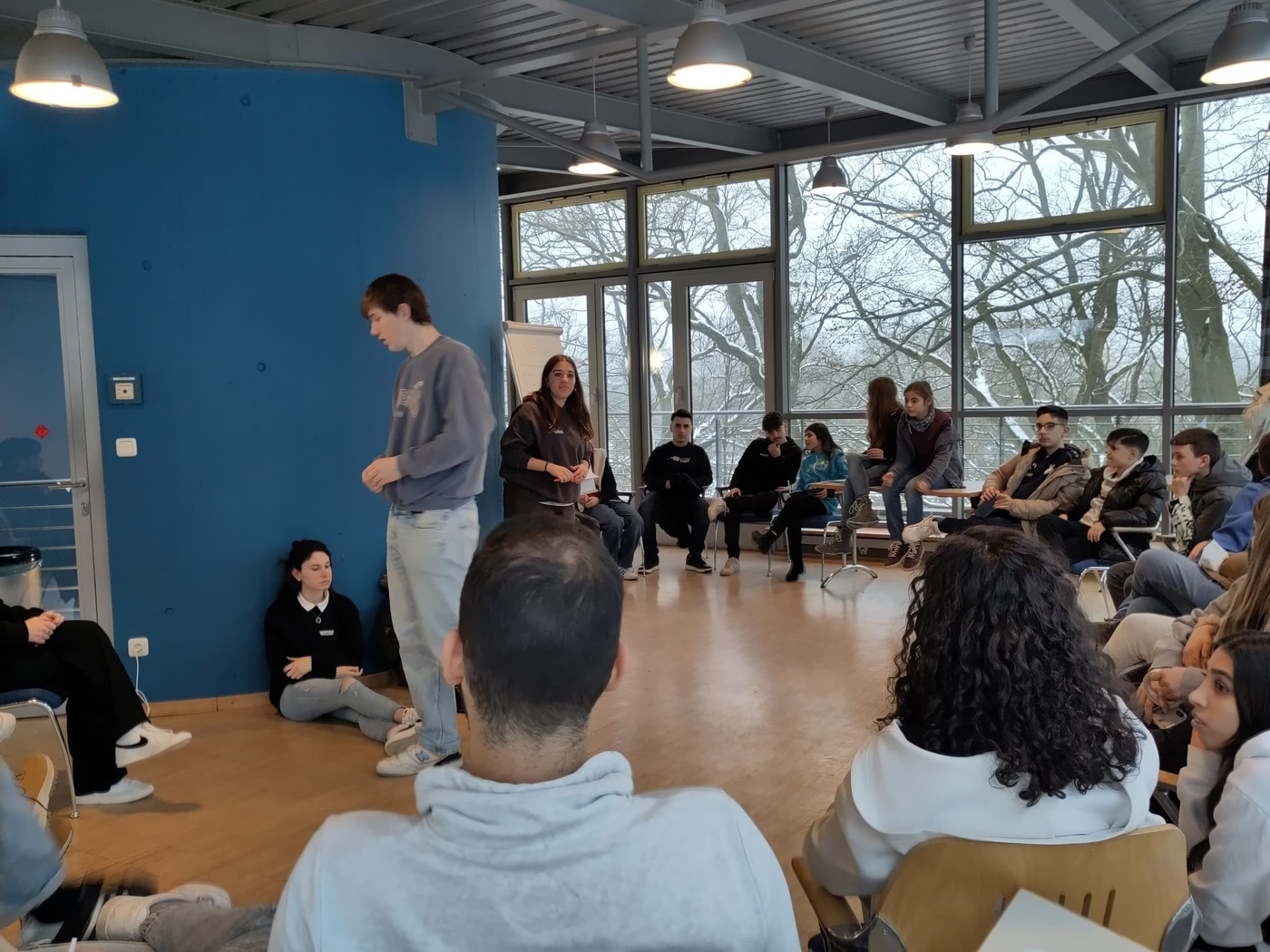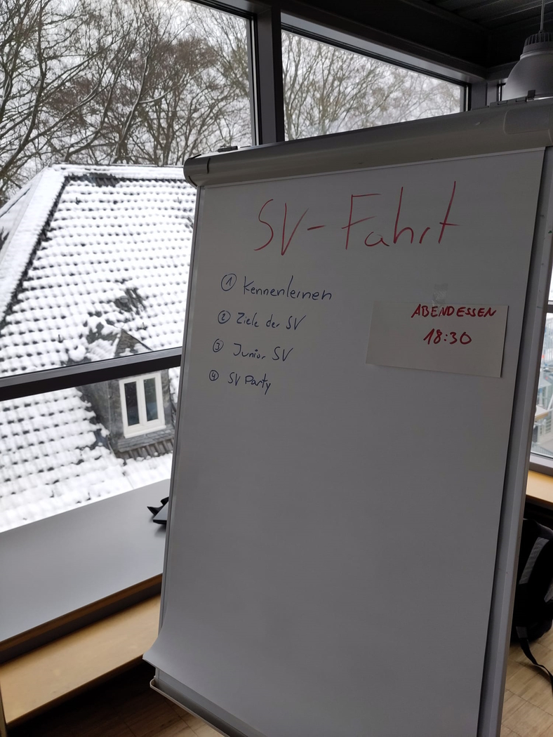 Die Schüler*innenvertretung (SV) setzt sich über das Schuljahr verteilt für eine Vielzahl an Projekten ein. Sei es die Nikolausaktion, die Karnevalsfeier oder die schulinterne Nachhilfevermittlung "Young Teachers". Um all diese Projekte gründlich zu planen und zu überarbeiten, bot dieses Jahr endlich wieder die SV-Fahrt den perfekten Rahmen. Für drei Tage und zwei Übernachtungen fuhr die SV in die Jugendherberge Aachen und konnte dort in Ruhe Teambuilding mit der Arbeit an verschiedenen Projekten verbinden. Im schneebedeckten Aachen wurde neben den konkreten Projekten auch über schulpolitische Themen diskutiert. Sei es die Überarbeitung der Hausordnung, das Essen in der Mensa oder eine Vertiefung des Nachhaltigkeitsprofils der Schule. Von 5. Klasse bis zur Q2 (13. Klasse) diskutierten die Schüler*innen offen und in freundschaftlicher Atmosphäre. Nach getaner Arbeit blieb dann auch noch genug Zeit, um das schöne Winterwetter zu genießen und am Abend auf der selbstgeplanten SV-Party noch weiter zusammenzuwachsen.
