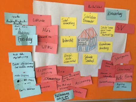 Die Schüler*innen hatten dabei auch viele Ideen, wie sie unsere Schule (noch) nachhaltiger machen können. So wollten die Schüler*innen des 5. und 6. Jahrgangs ihre Klassen mehr begrünen und dafür Sponsoren (z.B. Baumärkte) finden, die ihnen Pflanzen spenden. Schüler*innen des 9. Jahrgangs wiederum bemängelten, dass es nur etwa 200 Fahrradstellplätze für über 900 Schüler*innen an unserer Schule gibt. Sie wünschen sich diesbezüglich mehr Stellplätze, um mehr Mitschüler*innen zur Nutzung des Fahrrads zu motivieren. Eine andere Gruppe beschäftigte sich mit der neu an unserer Schule eingeführten Mülltrennung und entschied sich dafür, Mülldetektive und Müllscouts zu bestimmen, die mit Hilfe eines Punktesystems (Preis am Ende des Schuljahres) die Klassen auf die korrekte Mülltrennung kontrollieren. Die Müllscouts sollen wiederum die neuen Schüler*innen des 5. Jahrgangs ausführlich zum Thema „Müll“ schulen. Eine vierte Gruppe beschäftigte sich mit dem Thema „Frei Day“ (ein freier Tag pro Woche für selbst gewählte nachhaltige Projekte), die fünfte Gruppe möchte mehr Digitalisierung an unserer Schule.