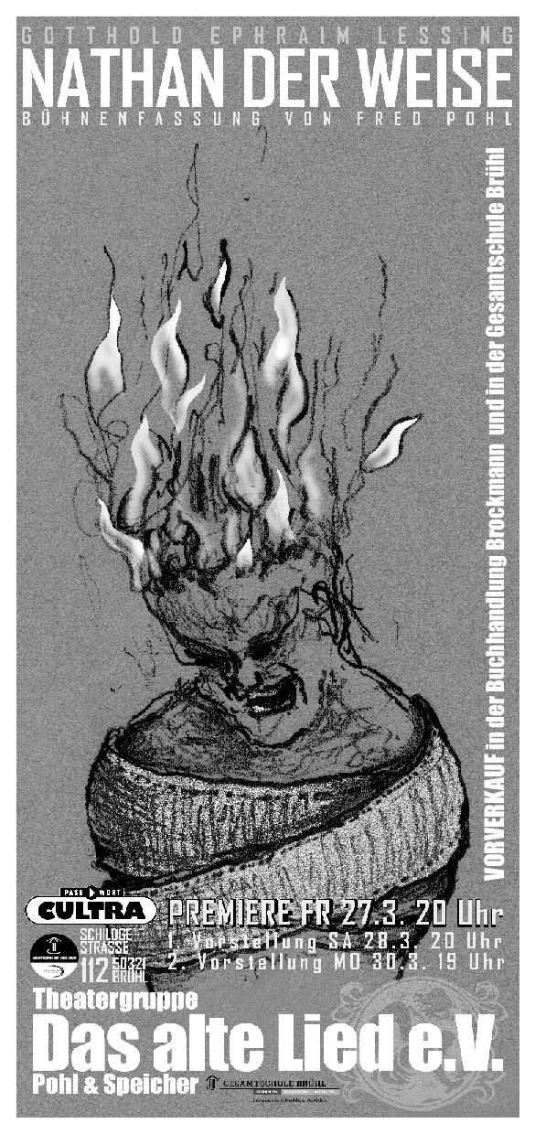 Am Freitag, 27. März 2020, öffnet sich im Brühler Jugendtheater Cultra um 20 Uhr der Vorhang für die diesjährige Premiere unserer Theatergruppe Das alte Lied. Sie möchte mit ihrer Version von Lessings „Nathan der Weise“ ein deutliches Zeichen gegen Antisemitismus, Intoleranz und Gewalt setzen. Im Zentrum steht dabei Nathans Schicksal, der zweimal zum Opfer von Pogromen wird und dennoch die Kraft findet, dem Wahnsinn etwas entgegenzusetzen und weiterzuleben. Seine berühmte Ringparabel wirbt noch heute für Menschlichkeit und Toleranz.
