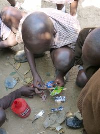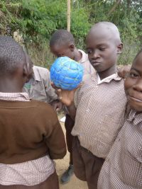 Das letzte Upcycling-Produkt waren die Fußbälle. Verschiedenster Müll wurde in eine Plastiktüte gesteckt und zu einem Ball gepresst. Die überstehenden Teile der Hauptplastiktüte wurden mit einem Stein abgeschnitten. Danach schnürten die Schüler den Ball mit einem dicken Faden zusammen.