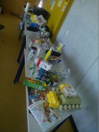 Dann ging es an das eigentliche Upcyceln von Abfall. Im Vorfeld hatten LehrerInnen und SchülerInnen bereits Berge von geeignetem Abfall gesammelt, so dass viel Material zum Basteln und Experimentieren zur Verfügung stand.
