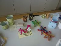 So bastelten die SchülerInnen aus ausrangierten Schulbüchern oder alten Comics wunderschöne Visitenkarten-/ Postkartenhalter. Aus alten Atlaskarten oder alten Kalenderblättern entstanden neue Briefumschläge oder Schmetterling-Mobilés. Alte Saft- und Milchtüten erlebten eine Wiederauferstehung als kleine Geldbörsen. Handy-Halterungen (zum Laden) wurden aus alten Shampoo- und Duschgelflaschen hergestellt. Aus alten Eierkartons entstanden kunstvolle Rosen zur Tischdekoration und aus alten Toilettenrollen Tischblumen und Eulen. Selbst eine alte Plastiktüte wurde wiederverwertet: In Streifen geschnitten und gehäkelt wurde daraus ein Handy-Täschchen. Aus alten Konservendosen und Marmeladengläschen wurden hübsche Aufbewahrungsbehälter geschaffen.