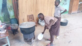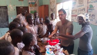 Als ich dann am nächsten Tag das Hackfleisch vom Metzger abgeholt und Holzkohle von einigen Frauen in Dunga gekauft hatte, machte ich mich auf den Weg zur Schule, wo Joram, Serge (der Restaurantbetreiber) und seine Frau bereits warteten. Als die Kinder dann ebenfalls versammelt waren erklärten wir zuallererst unser Vorhaben und was für Gerichte wir zusammen kochen würden - die Vorfreude der Schüler war groß.