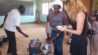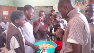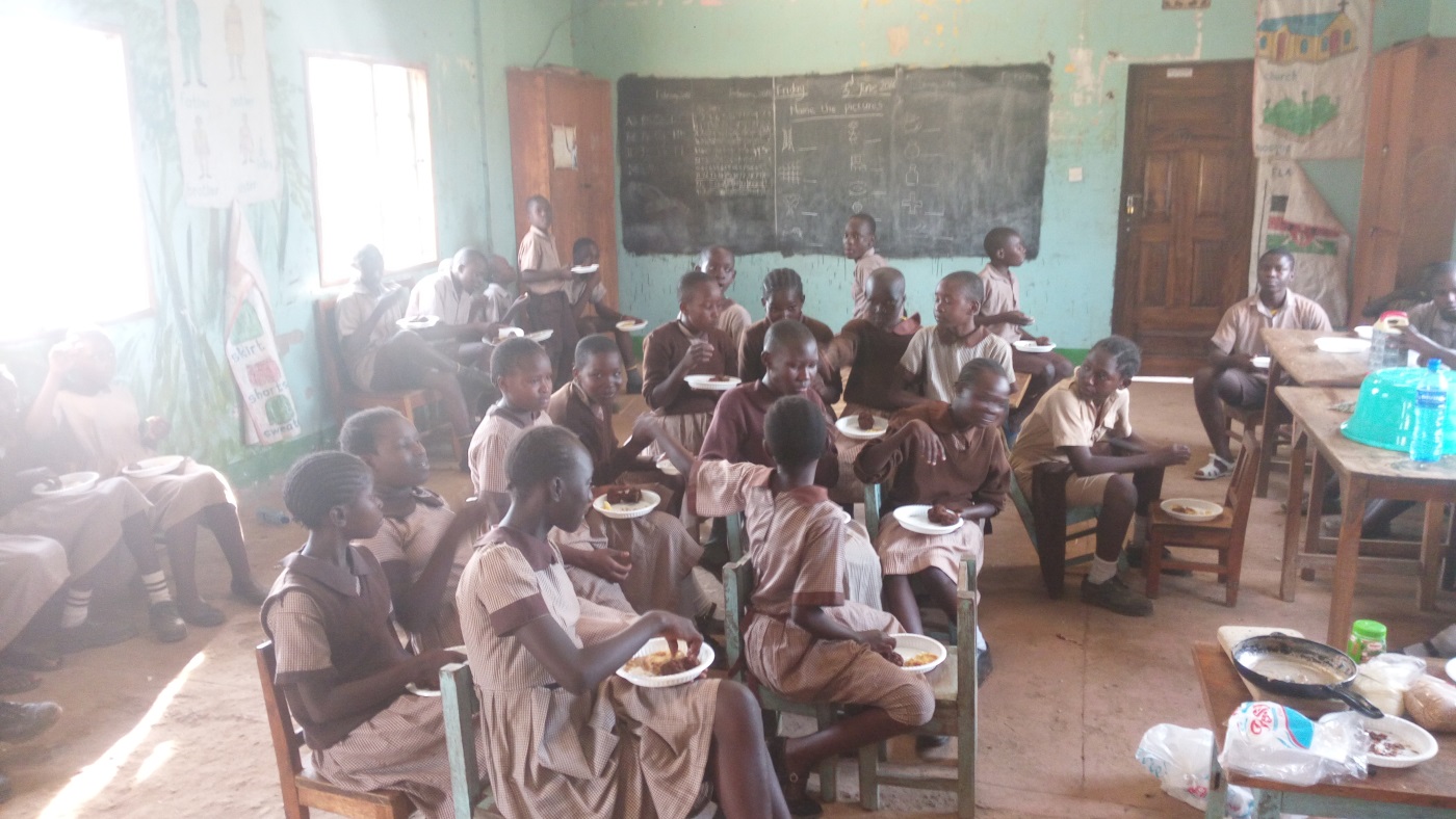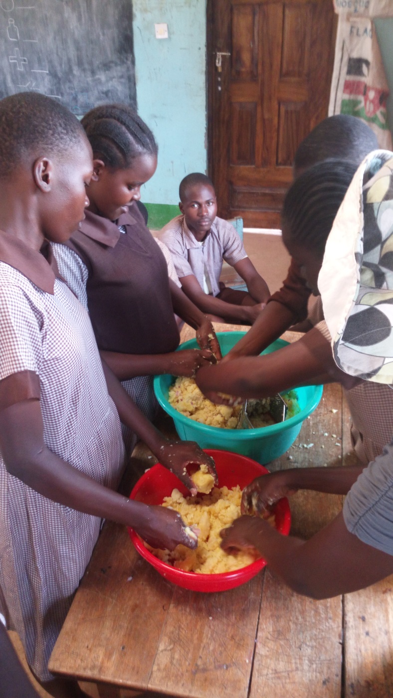 Es dauerte insgesamt 3-4 Stunden, bis die Schüler endlich essen konnten. Während dieser Zeit saßen alle ganz geduldig und relativ ruhig auf ihren Plätzen und warteten auf das heiß ersehnte Essen, ich war ganz perplex und beeindruckt von ihrer Geduld. Als erstes durfte der Head Teacher probieren, zu den Kartoffelpuffern hatten wir noch schnell eine braune Sauce gemacht, damit es nicht zu trocken wurde. Er war auch ganz begeistert. Zu dem Zeitpunkt waren wir alle schon ziemlich verschwitzt und müde, da es so lange gedauert hatte und auch recht anstrengend gewesen war, doch als die Kinder endlich essen konnten wussten wir, dass es sich gelohnt hatte, denn die Begeisterung war riesig! Allen schmeckte es und mir wurde mehrmals aufgetragen, ganz liebe Grüße und ein großes Dankeschön dafür, dass dieses Projekt ermöglicht wurde, nach Brühl zu schicken.