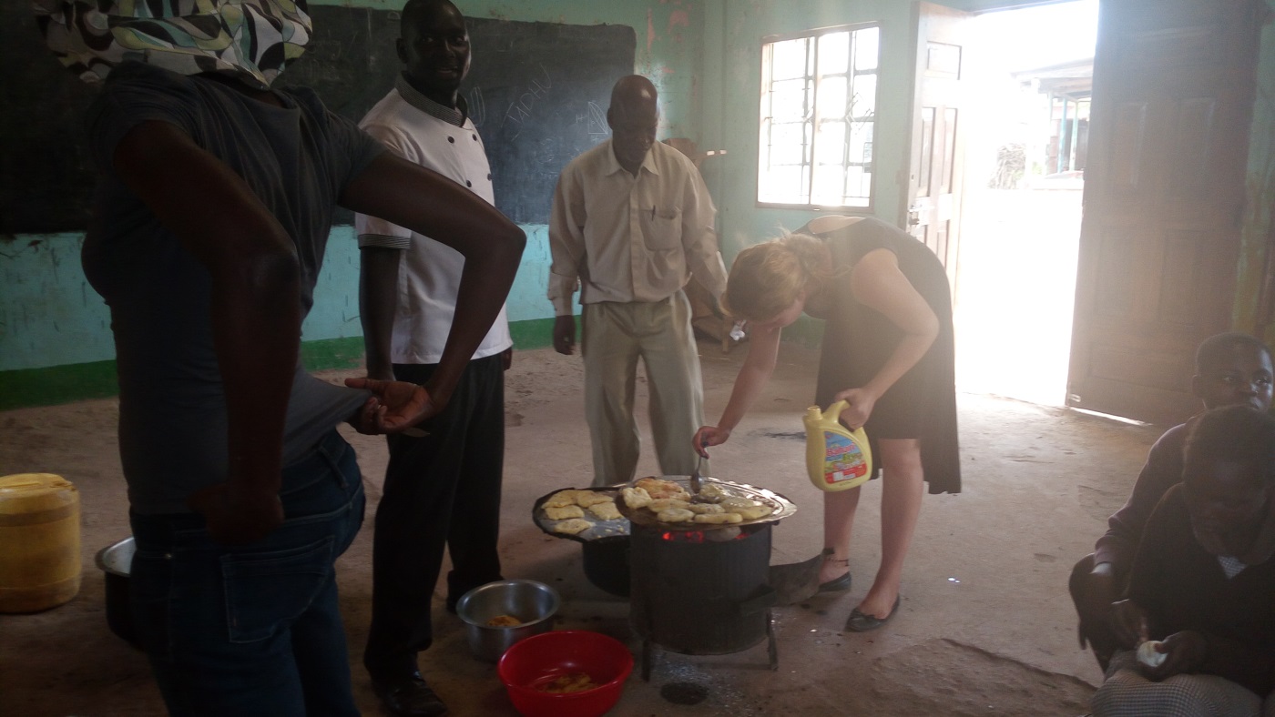 Also fingen wir an die Frikadellen zu machen, einige der Schüler konnten beim Schneiden der Zwiebeln und andere beim Vermischen des Hackfleisches mit den Gewürzen helfen, während die anderen Serge und seiner Frau zuhörten, die erklärten, woher diese Gerichte stammen. Ähnlich ging es auch bei den Kartoffelpuffern voran, sodass wir durch die ganze Hilfe schnell mit den Vorbereitungen fertig waren und es an das richtige Kochen gehen konnte. Dafür hatten wir einen großen und einen kleinen Kohlegrill bzw. -ofen, in Kenia “jiko” genannt. Einfachheitshalber frittierten wir die Frikadellen statt sie einzeln zu braten. Trotzdem dauerte dieses sehr lange – noch viel länger brauchten jedoch die Kartoffelpuffer. Wir brieten sie auf dem Deckel eines großen Kochtopfes, den wir auf den Grill gelegt hatten.