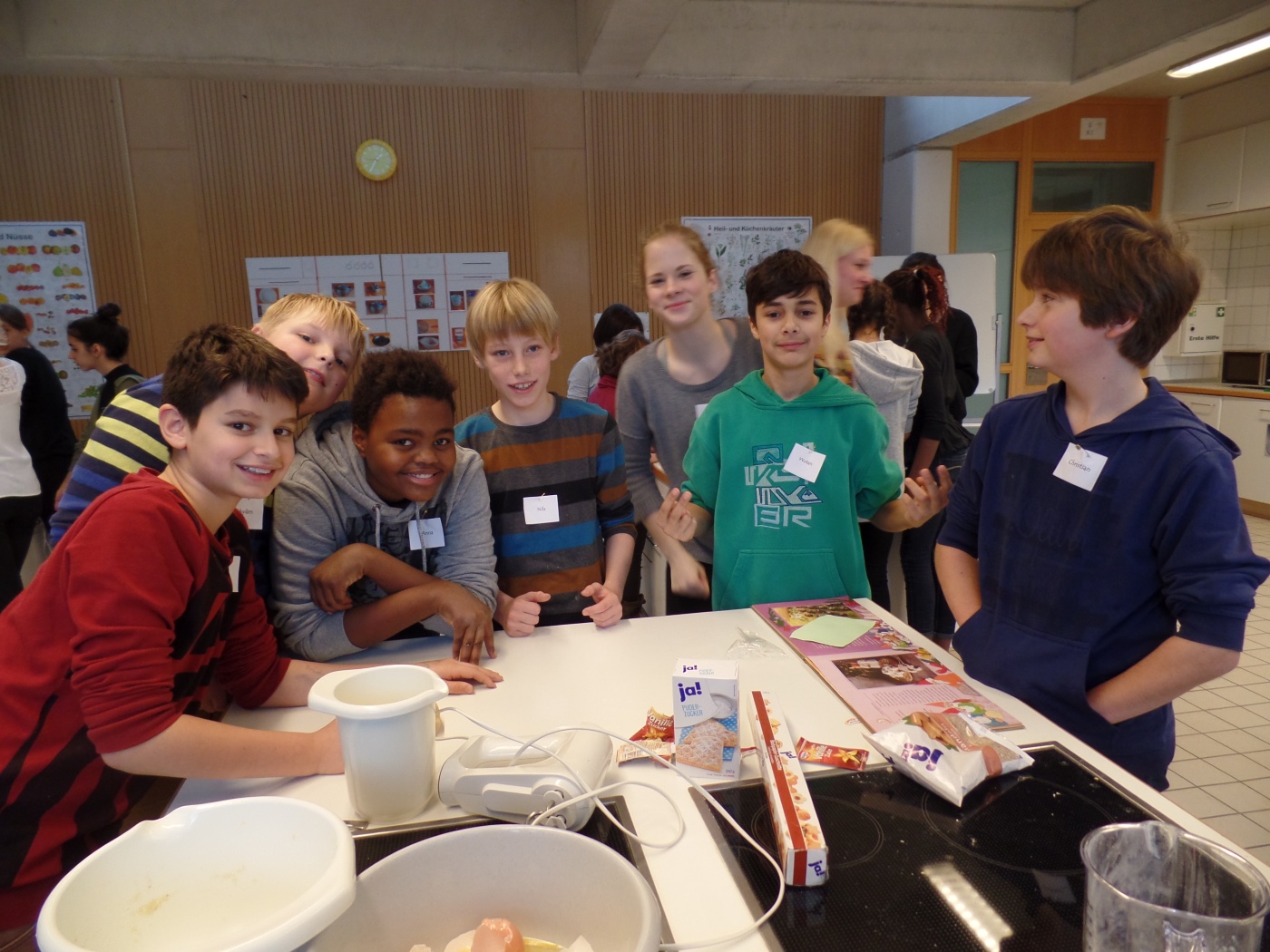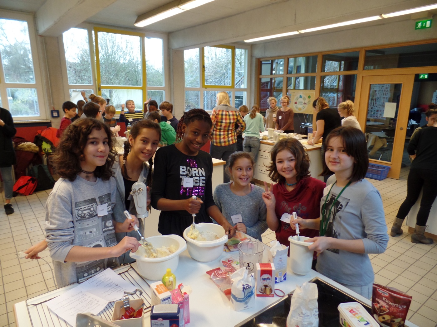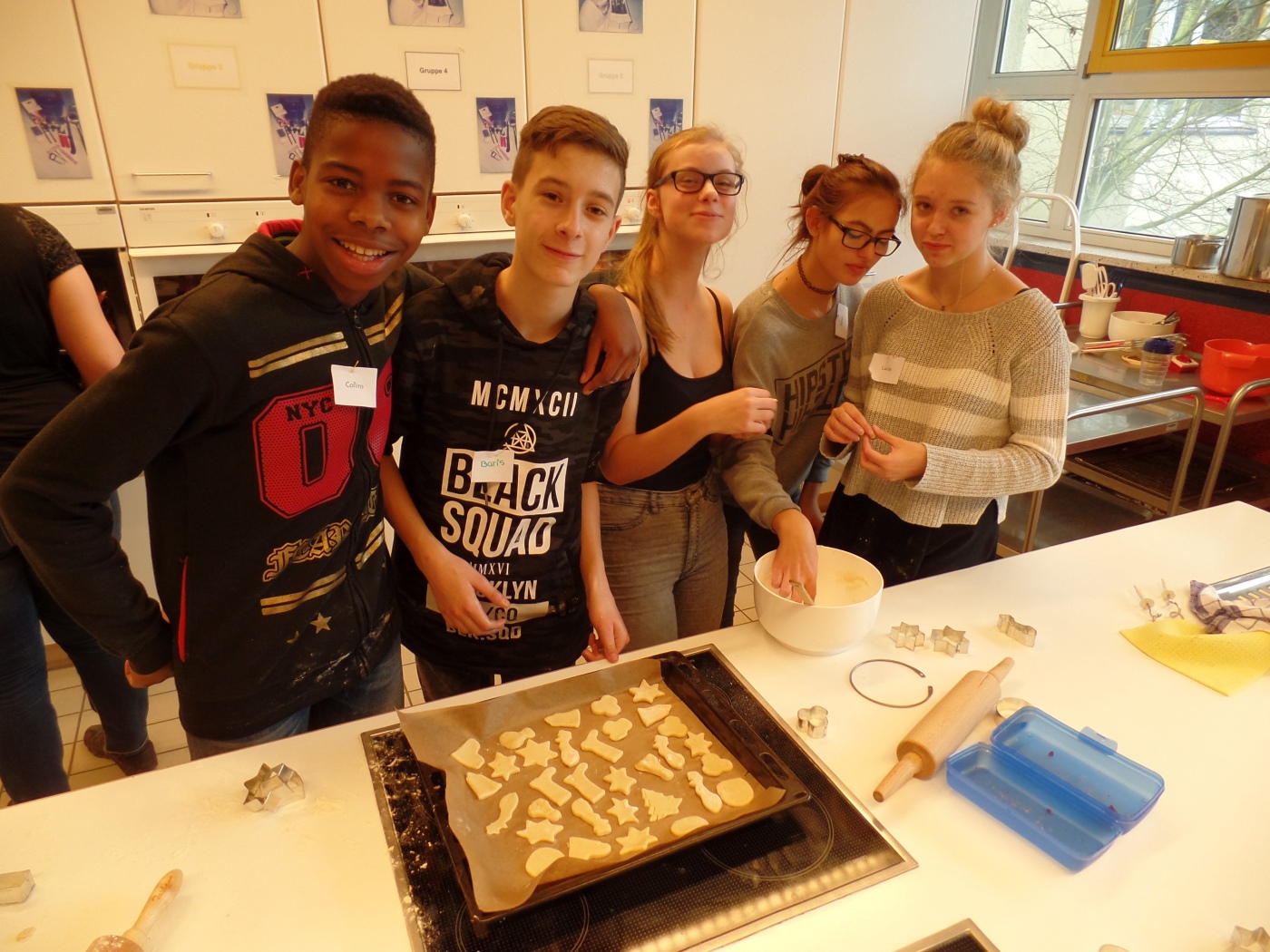 Am besten bei einer Plätzchenback-Aktion, bei der man zusammen rühren, kneten, quatschen, lachen und naschen kann. Und so füllt sich auch schon bald die Schulküche mit 35 Schülerinnen und Schülern aus dem 6., 8. und 9. Schuljahr bepackt mit Mehl, Butter, Eiern und anderen guten Zutaten und den besten Familienrezepten für Plätzchen. Es duftet herrlich in der Küche, als die Plätzchen in den Backöfen goldgelb backen und die vollen Bleche herausgezogen werden.