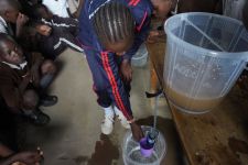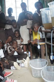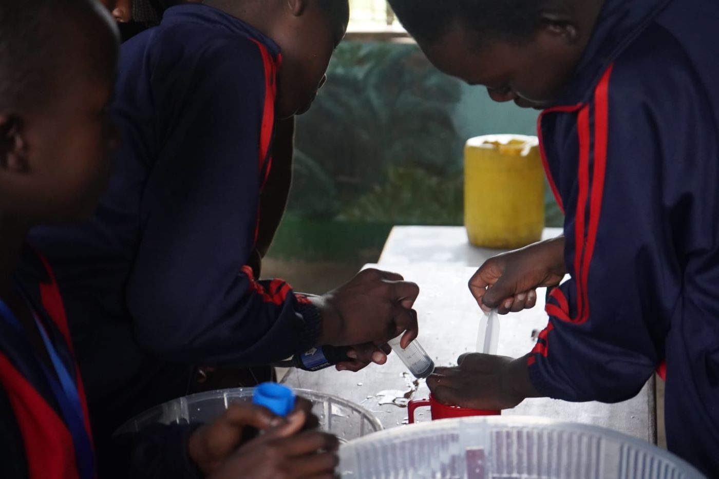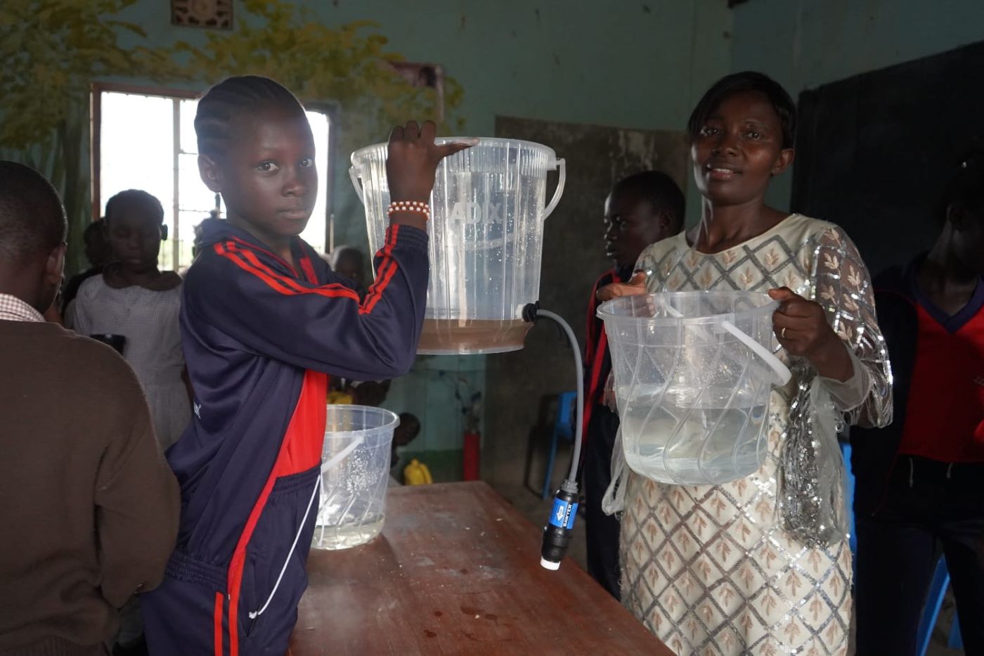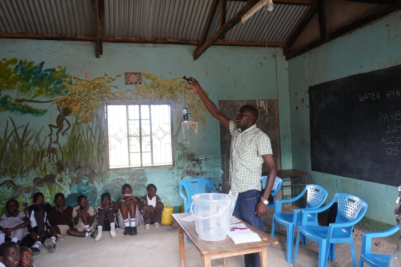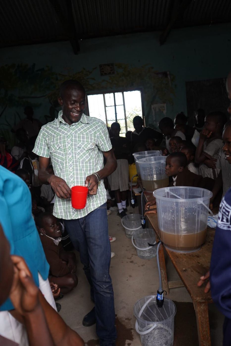 Erst einmal haben wir die Schüler*innen gefragt, wo sie normalerweise zuhause ihr Wasser herbekommen. Einige Kinder haben gesagt, dass sie ihr Wasser aus der Leitung, vom Fluss, aus dem Brunnen oder vom See bekommen. Über die letzten Jahre ist der See Viktoria sehr verschmutzt und kontaminiert worden mit menschlichen Ausscheidungen, Plastik, aber auch mit Abwässern von größeren Fabriken. Dementsprechend ist das Wasser nicht trinkbar und muss behandelt werden. Die Kinder erzählten uns, wie sie ihr Wasser, egal woher sie es bekommen, behandeln, um es trinkbar zu machen. Die meisten Familien kochen das Wasser ab oder benutzen Water Guard, eine Chlorlösung, die Bakterien abtötet, wenn man sie mit dem Wasser mischt. Die Schüler*innen hatten schon sehr viel Wissen darüber, was passiert, wenn man unbehandeltes Wasser trinkt. Die Menschen können krank werden, Durchfall, Bauchweh oder Cholera bekommen. Das Problem ist, dass die Wassersäuberung meist sehr zeitaufwendig oder teuer ist oder teilweise einfach nicht vorhanden, wenn man Durst hat. Auch die falsche Aufbewahrung von behandeltem Trinkwasser kann zu Krankheiten führen. Nachdem wir mit den Kindern ausführlich über Wasserhygiene geredet hatten, haben wir ihnen eine neue Methode vorgestellt, wie man Wasser trinkbar machen kann.