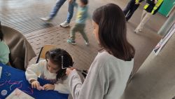 Ein besonderes Highlight für die Mädchen war, dass unsere Schülerinnen ihnen bunte Zöpfe flochten und sie selbst bunte Perlenarmbänder basteln konnten.