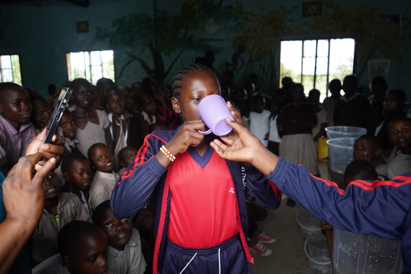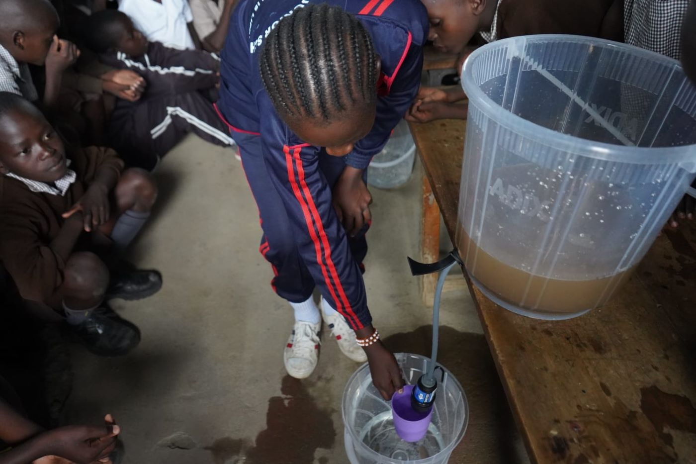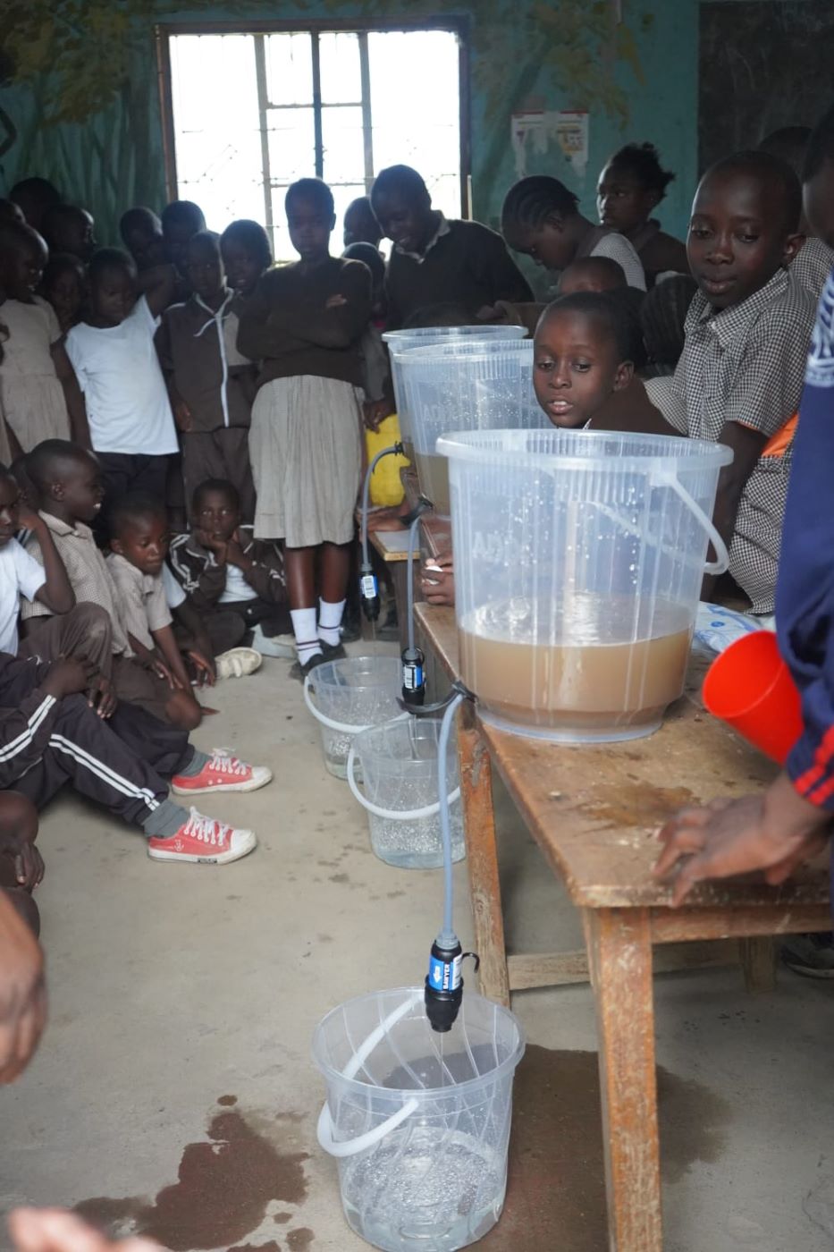 Die Sawyer Water Filter, die eine Membran zum Filtern vom Wasser benutzen, garantieren eine Entfernung von Bakterien, Keimen, Schmutz und Mikroplastik. Wir haben zusammen mit den Kindern die Filter zusammengebaut und dann ausprobiert. Hierzu haben die Schüler*innen schmutziges Wasser gefiltert und innerhalb weniger Minuten war das Wasser klar und nicht mehr braun. Schüler*innen und Lehrkräfte hatten dann die Möglichkeit, das Wasser zu probieren und zu trinken.